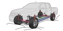 Khung gầm xe HILUX được cải tiến với tiết diện 2 bên sườn tăng thêm; bổ sung thêm các mối hàn; tấm che gầm xe được thiết kế lại và nâng cao độ bền, qua đó giúp xe vận hành ổn định và chắc chắn hơn. Khách hàng không những cảm thấy tự tin khi vận hành mà hoàn toàn yên tâm về khả năng chở tải nặng của xeAn toàn